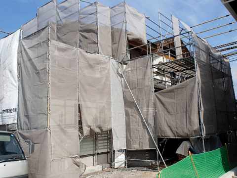 佐賀県唐津市の現場は、吹付断熱工事が 終わり外壁工事に掛かっています。