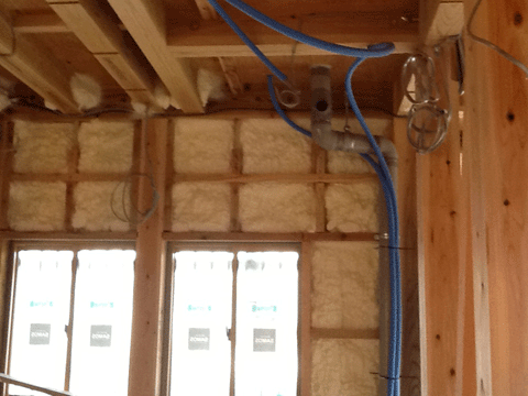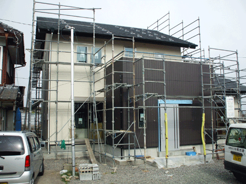 吹付断熱工事も終わり 今は、外装板を貼っています。
