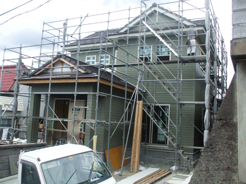 佐世保市天神町の現場は、 外装板も張り終え、 吹付け断熱工事も終わりました。 だいぶ、外観が見えて来ました。