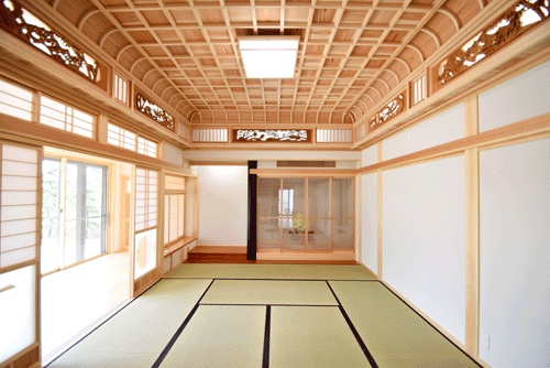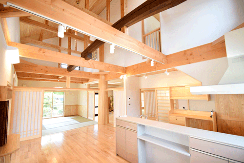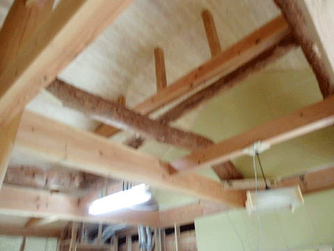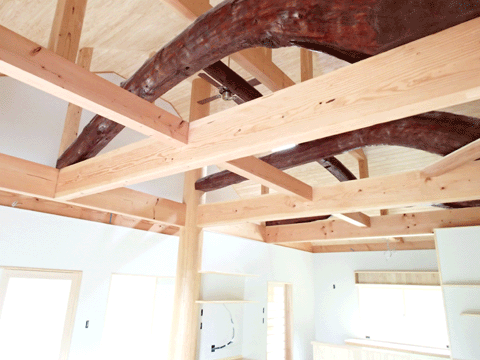 旧宅の梁を4本使いました。 写真のとおり大きく曲がった梁です。 昔は重機も無いですから、手作業で 屋根裏まで上げたと思われます。 ビックリです。